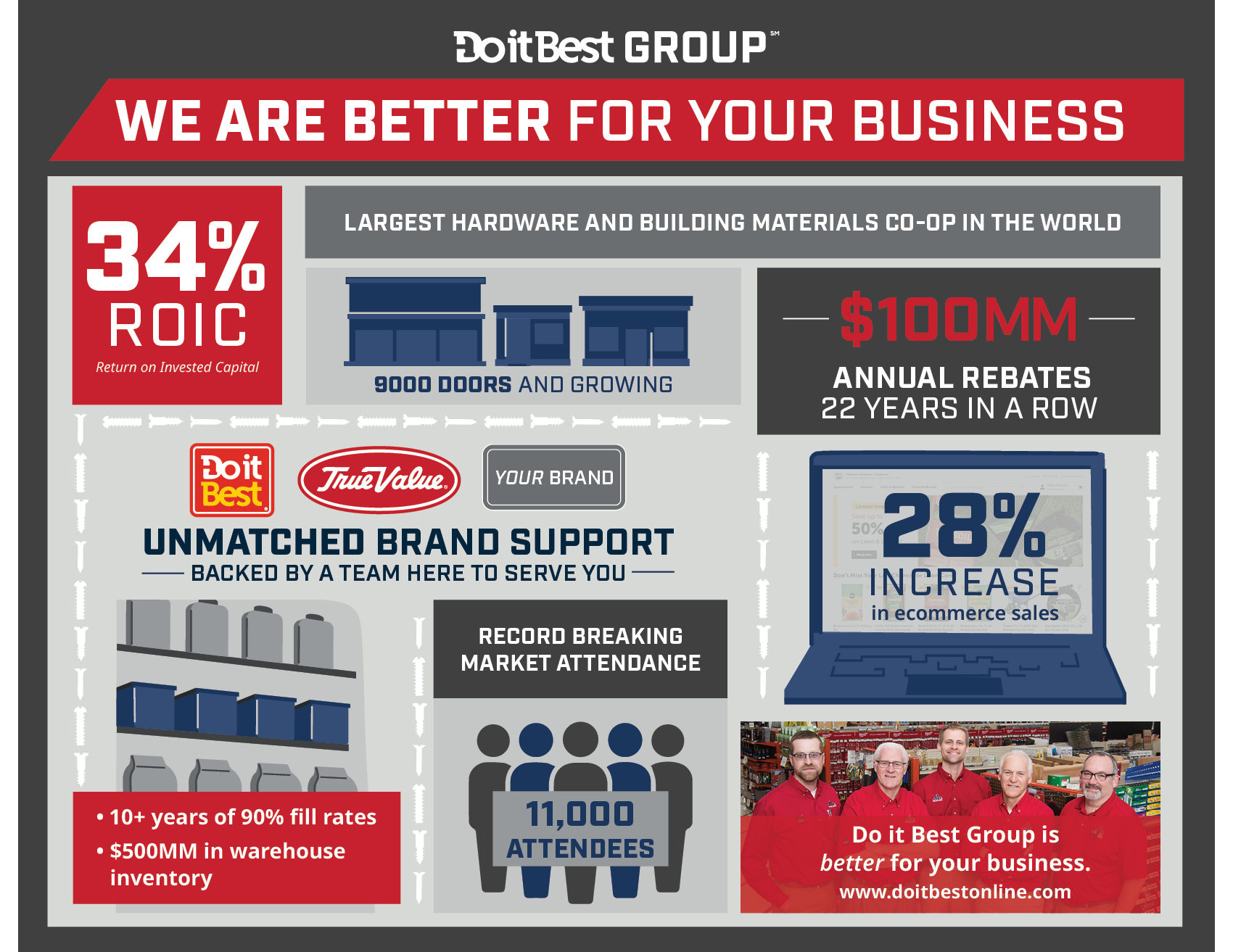 Headquartered in Fort Wayne, IN, the Do it Best Group is the world’s largest hardware, lumber, and building materials buying cooperative in the home improvement industry. With nearly $6 billion in annual sales, we support thousands of independently owned locations across the United States and in more than 60 countries worldwide. Partners in the company have the flexibility to operate under the Do it Best, True Value, or their own local store identities, offering a diverse range of branding options to best serve their communities. For more information, visit doitbestonline.com and follow us on Facebook, Instagram, and LinkedIn.